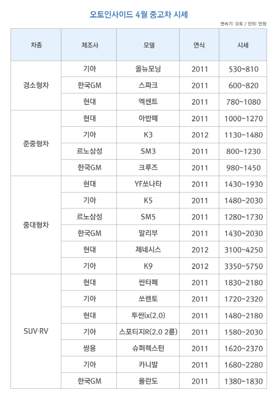 이에대해 오토인사이드 관계자는 "사회 초년생들이 중고차 시장을 가장 많이 찾는 봄철인 만큼 저렴한 시세의 경소형차가 인기"라고 밝혔다.