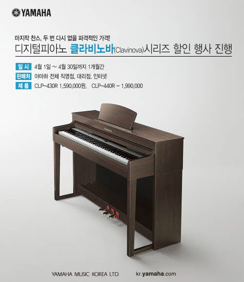 세계적인 악기음향전문기업 야마하뮤직코리아㈜(대표: 야마다 토시카즈)는 다가오는 5월 가정의 달을 맞이해 일부 디지털피아노 모델을 파격적인 할인가에 제공한다고 8일 밝혔다.