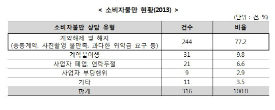소비자원이 1372 소비자상담센터에 접수된 아기성장앨범 관련 소비자 불만 건수를 집계한 결과 2011년 174건, 2012년 208건, 2013년 316건으로 매년 증가한 것으로 드러났다.