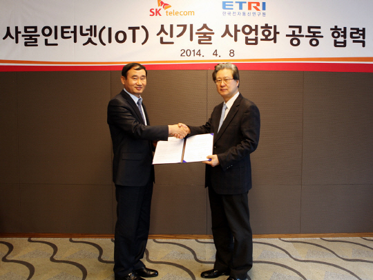 SK텔레콤(대표이사 사장 하성민)이 한국전자통신연구원(원장 김흥남)과 사물인터넷(Internet of Things, 이하 IoT)분야 신기술 사업화 협력을 위한 양해각서(MoU)를 8일 체결했다.