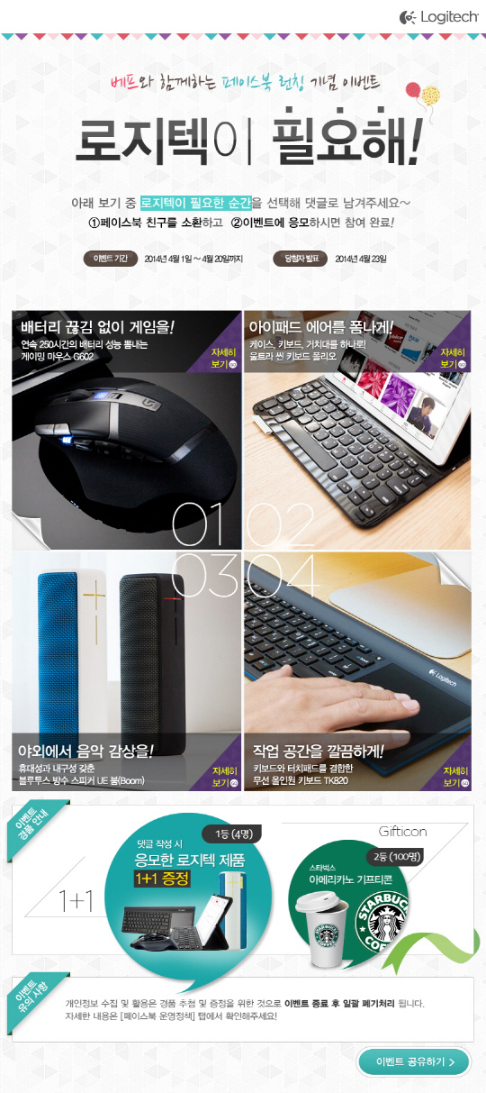 페이스북 오픈 이벤트는 로지텍 코리아의 페이스북에 방문해 '좋아요'를 누르면 누구든지 참여 가능. 좋아요를 누른 뒤 댓글로 지인을 소환하고 원하는 로지텍 제품을 선택해 필요한 이유를 적으면 응모할 수 있다. 추첨을 통해 4명에게는 당첨자 본인과 댓글로 소환한 친구에게 각각 무선 게이밍 마우스 G602, 올인원 키보드 TK820, 아이패드 에어용 울트라 씬 키보드 폴리오 및 UE 붐 중 자신이 선택한 제품 한 개씩 제공하며, 100명에게는 스타벅스 기프티콘을 증정한다. 당첨자는 4월 23일 로지텍 코리아 페이스북을 통해 확인 가능하다.