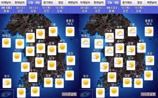 9일은 서해 상에 있는 고기압의 영향을 받아 전국이 대체로 맑겠다. 다만 중부지방은 북쪽을 지나는 기압골의 영향을 점차 받아 늦은 오후부터 구름이 많아질 것으로 기상청은 내다봤다.