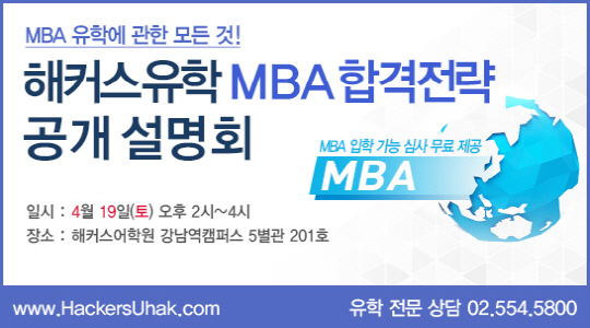 유학, 연수 전문 해커스유학(www.HackersUhak.com)이 19일 서울 강남역 인근 해커스어학원 강남역캠퍼스에서 미국과 영국의 최상위 MBA 소개 및 MBA 예비과정 합격 전략 설명회를 무료로 개최한다.