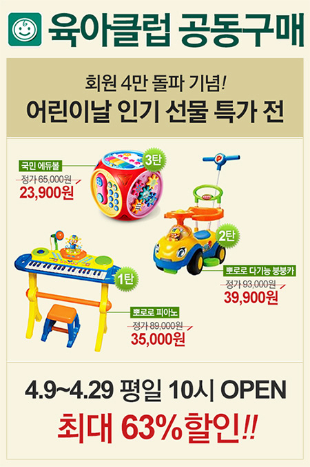 육아클럽 회원이라면 누구나 참여 가능한 이 공동구매 이벤트는, 어린이 및 엄마들에게 가장 인기가 높은 '국민 장난감' 에듀볼(89,000원→35,000원), 뽀로로 피아노(65,000원→23,900원), 뽀로로 붕붕카(93,000원→39,900원) 등의 인기 완구들만을 엄선하여 시중 판매가보다 63% 할인된 파격적인 가격으로 매일 일정수량 선착순 제공하고 있다.
