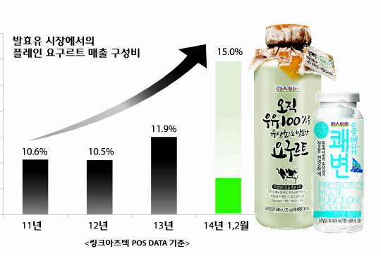 한국도 1인당 유제품 소비량이 2013년 71.3kg을 기록하며 쌀 소비량(67.2kg)을 넘어섰다. 플레인 요구르트의 성장세가 두드러져 2012년 4.9%에 그쳤던 플레인 요구르트의 성장률은 2013년 그 두 배인 9.6%를 기록했다. 전체 발효유 시장에서 플레인 요구르트의 구성비 역시 2012년 10.5%에서 2013년 11.9%로 상승했다. 2014년 1~2월에는 15.0%의 구성비를 기록하며 플레인 요구르트 상승세가 계속되고 있다.