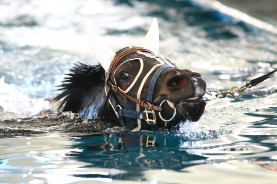 ◇따뜻한 봄철 경마공원 경주마들의 춘곤증을 막기 위해 다양한 방법이 동원되고 있다. 수영이 특히 선호된다.