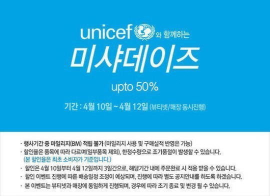 이번 세일은 '유니세프와 함께 하는 미샤데이즈'로 오프라인과 온라인에서 모두 적용된다.