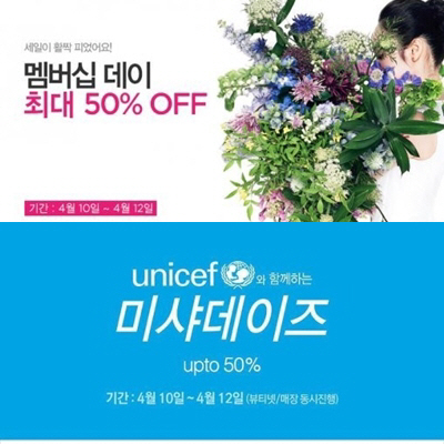 미샤 vs 아리따움 최대 50% 세일 전쟁