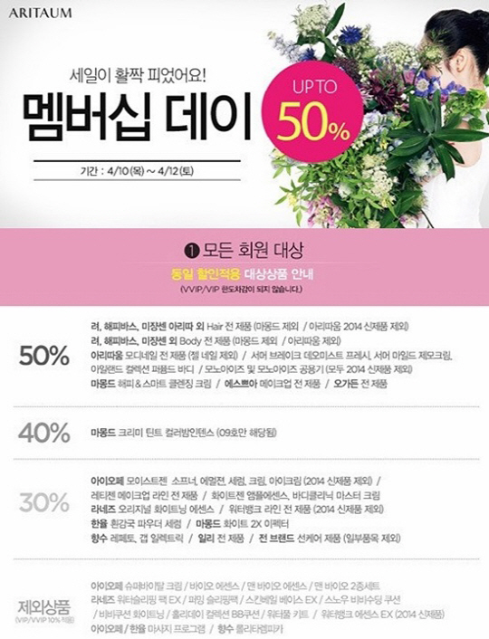 10일 아리따움은 공식 홈페이지를 통해 10일부터 오는 12일까지 멤버십 회원 대상으로 최대 50%를 할인하는 멤버십데이 행사를 진행한다고 밝혔다.