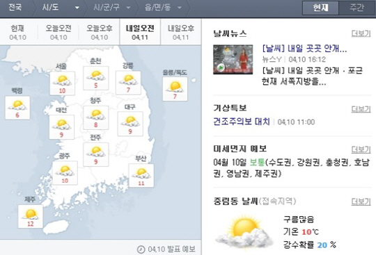 내일 아침 날씨의 예상 최저기온은 △서울 10도 △대전 7도 △부산 11도 △대구 9도 △광주 9도 등으로 오늘(10일)과 비슷할 것으로 보인다.