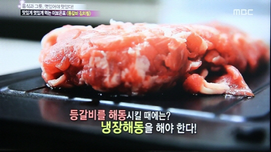 이보은 요리사는 "냉동 보관된 등갈비를 이렇게 보드에 올려놓고 해동하면 육즙도 살고 육질도 부드러워져 음식의 맛과 영양을 살릴 수 있다"고 말했다.