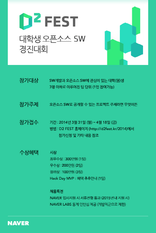 네이버㈜(대표이사 사장 김상헌)가 대학생들이 직접 오픈소스 소프트웨어를 만들고 체험할 수 있는 개발자 경진대회인 'D2 FEST 2014'를 개최한다.