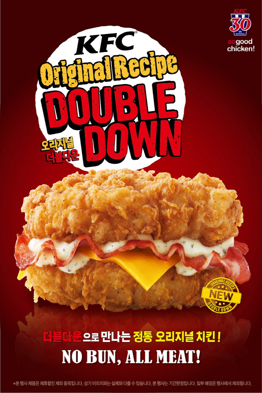 KFC(http://www.kfckorea.com)가 한국 진출 30주년을 기념해 30년 간 꾸준히 사랑 받아온 '오리지널 치킨'을 버거로 즐길 수 있도록 '오리지널 더블다운'을 출시한다.