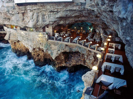 이 레스토랑은 이탈리아 풀리아의 한 호텔에 위치, 날이 저물고 조명이 켜진 후의 야경은 일품이다. 은은한 조명과 함께 파도소리를 즐기며 식사를 할 수 있는 이 바다 절벽 레스토랑은 최근 SNS 등을 통해 소개되면서 전 세계 네티즌들의 이목을 끌고 있다.