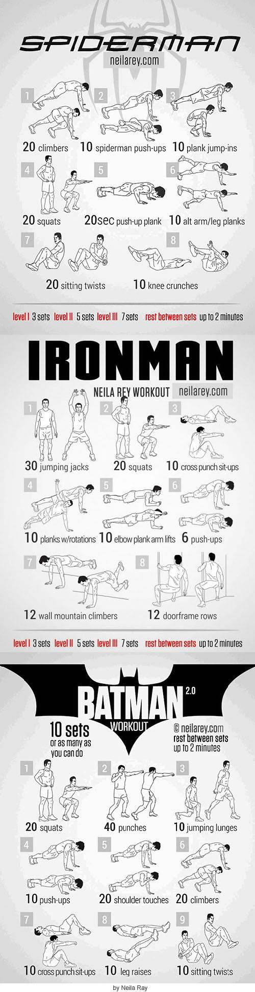 이 운동 교본에는 각기 다른 능력을 가진 슈퍼히어로들의 특성에 맞는 운동법이 그려져 있다.