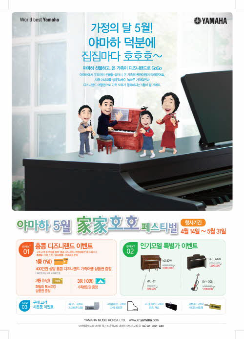 이번 행사는 5월 말일까지 전국 직영점과 대리점에서 진행되며, 야마하는 100만원 이상 구매 고객 중 추첨을 통해 1등 1명에게 홍콩 디즈니랜드로 여행을 떠날 수 있는 400만원 상당의 가족여행 상품권을 증정할 예정이다. 또한 2등 5명에게는 빕스(VIPS) 패밀리 레스토랑 상품권이, 3등 10명에게는 가족캠핑권이 증정된다. 응모방법은 각 지점에 비치된 응모권에 제품 구매 날짜와 모델명 등 상세내역을 적어 해당 지점에 전달하면 된다.