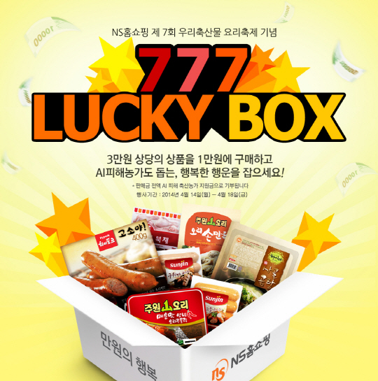 14일부터 NS홈쇼핑의 온라인몰인 NS몰과 소셜커머스 티몬에서 소, 돼지, 오리, 닭 등 4가지 우리 축산물로 구성된 3만원 상당의 NS럭키박스를 1만원에 판매한다.