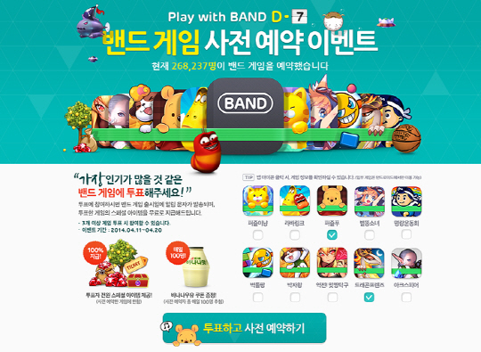 캠프모바일은 11일 '밴드 게임'의 론칭을 열흘 앞두고, 1차로 참여하는 게임 10종을 공개하면서, 사전 예약 이벤트( www.band.us/event ) 를 시작한 바 있다.