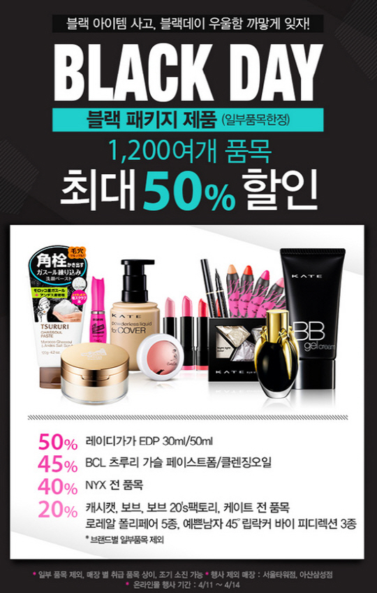 올리브영은 솔로들을 위한 '블랙데이&맨즈데이' 이벤트를 12일부터 14일 까지 진행, 블랙 패키지 아이템 1,200여개 품목 한정 최대 50% 할인 및 남성용 선 케어, BB크림 전 품목 일정금액 할인 혜택을 제공한다.