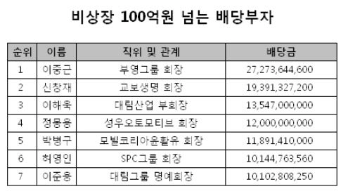 한편, 100억원 이상의 비상장 배당부자는 이중근 회장이 272억7000여만원으로 1위를 차지했다.
