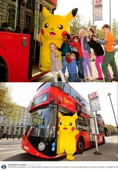 해당 사진은 '버스의 해'를 기념해 영국 런던의 교통 당국이 진행한 이벤트 당시 촬영한 것으로, 사진 속 엄청난 크기의 피카츄는 영국의 상징 중 하나인 빨간 2층 버스에 올라타려 하고 있다.