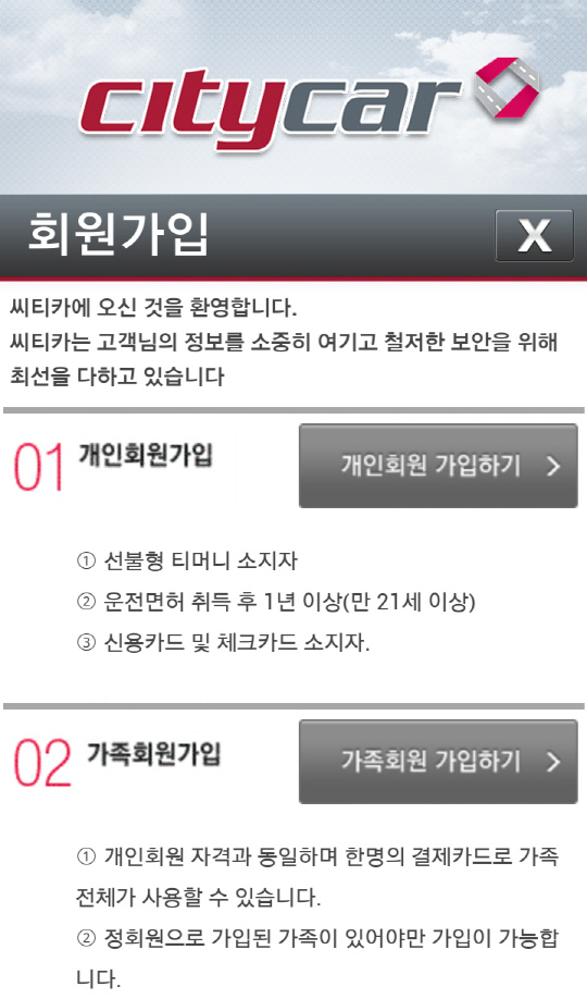 씨티카 홈페이지(www.citycar.co.kr)와 스마트폰의 씨티카앱을 다운 받아 회원 가입하면 편리하게 이용이 가능하다.