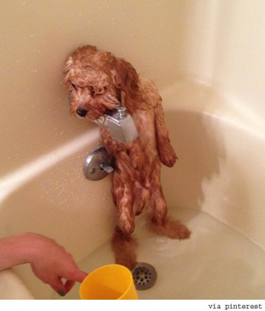 그러나 이 강아지는 씻기 싫은 듯, 욕조 수고꼭지에 딱 붙어 기댄 채 서서 주인을 외면하고 있어 보는 이들을 폭소케 하고 있다.