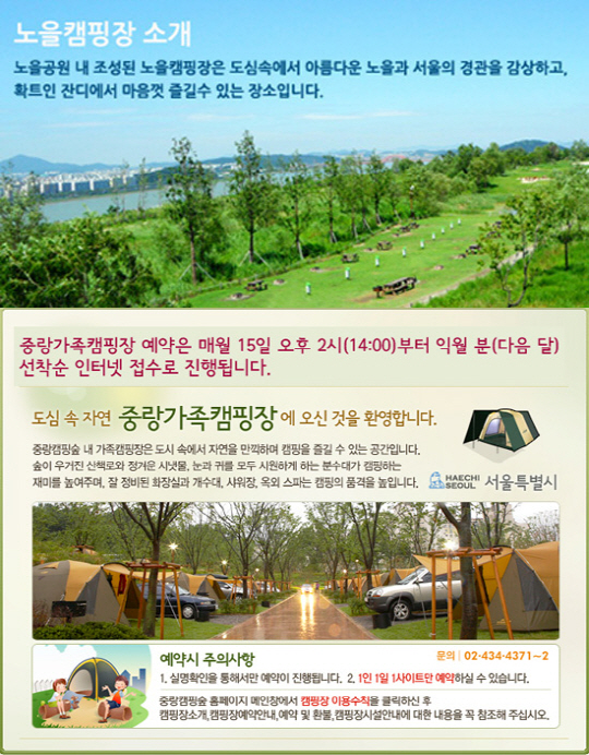 서울시 서부공원녹지사업소는 노을캠핑장을 다음달 1일부터 부분 개장, 15일부터 예약을 시작했다. 개장구역은 비교적 잔디 상태가 양호하고 전기시설을 이용할 수 있는 F,G 구역 70면, 나머지 80면은 다음 달 25일부터 운영한다.