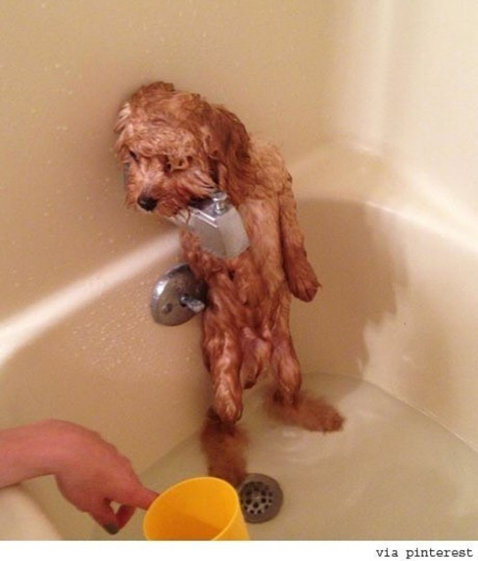특히 강아지는 물과 주인의 손길을 피해 사람처럼 두 다리로 욕조 수도꼭지에 기대 있는 모습으로 웃음을 자아낸다.