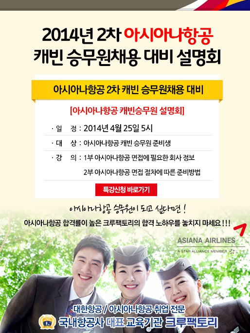 아시아나항공 2차 캐빈승무원 채용설명회와 4월 28일 수강신청 안내는 홈페이지www.crewseoul 02.2038.7274로 할수 있다.