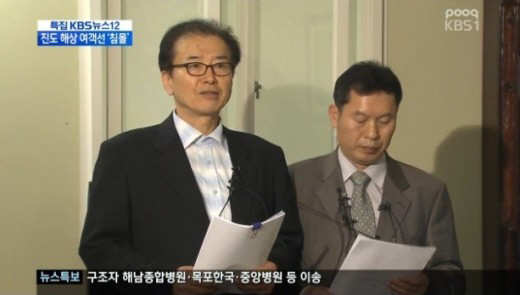 16일 오후 인천시 중구 인천연안여객터미널 청해진해운 선사에서는 '진도 여객선 침몰 사고'에 관련한 공식 브리핑이 열렸다. 이날 브리핑에는 김영붕 청해진해운 기획관리실 상무와 김재범 기획관리부장이 참석했다.