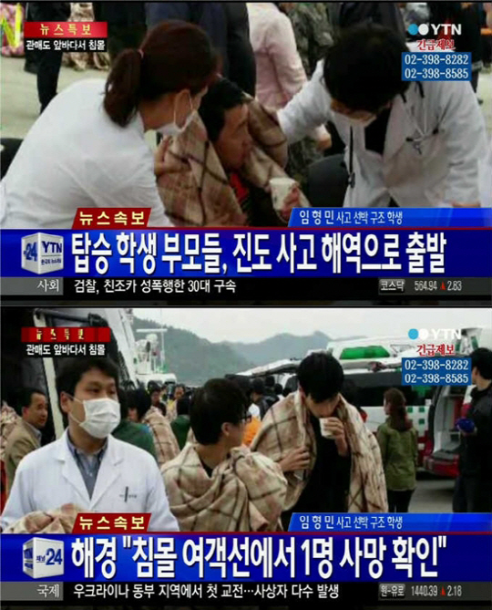 보도에 따르면 사진에는 해상에서 구조돼 구급차로 이송된 학생들의 모습이 담겨 있다. 특히 바다에 빠져 저체온증에 있던 학생들은 담요를 덮거나 따뜻한 것을 섭취하는 등 몸을 녹이고 있다.