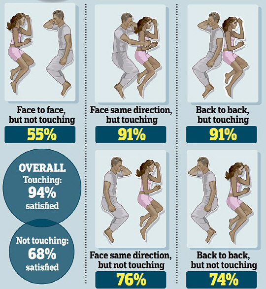 사무엘 던켈 박사는 "수면중 방향도 중요하지만 신체 접촉의 여부가 커플간의 행복지수에 더 크게 작용한다는 것을 알 수 있었다"고 설명했다.