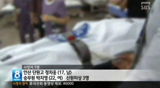 현재까지 확인된 사망자는 안산 단원고 2학년 정차웅 학생과 선사 여직원 박지영 씨 등 2명이 숨졌고, 학생으로 추정되는 남성 사망자 1명이 확인된데 이어 사망자 2명이 추가 발견돼 사망자는 5명으로 늘었다.