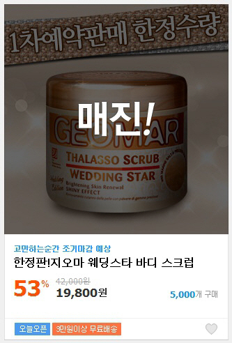 22일 일괄배송이 되는 지오마 한정판 웨딩스타 스크럽은 21일 소셜커머스에서 1차 예약판매분을 제외한 나머지 수량을 판매할 예정이다.