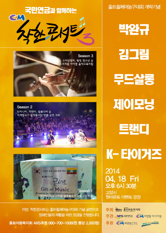 한층 더 착해진 씨앤앰 착한콘서트 시즌3는 18일 오후 6시 30분 경기도 고양시 호수공원 옆 원마운트 야외공연장에서 첫 무대를 가진다. 이번 공연은 18일부터 열리는 제20회 홀트국제휠체어농구대회를 축하하며 국내외 장애인 농구단 8개팀 150 여명이 함께 한다.