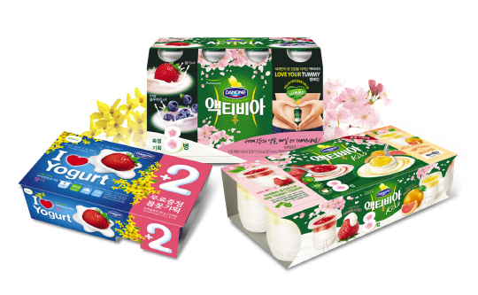 '아이러브요거트' 팩은 봄의 대표적인 꽃인 개나리를 이용하여 봄의 따뜻한 생기를 표현했고 배경의 컬러와 대비를 이루며 조화되도록 했다. '액티비아' 팩들은 만개한 벚꽃 잎이 흐드러진 꽃길을 걷는 느낌으로 디자인된 것이 특징이다.