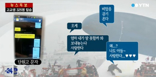 안산 단원고 신모 군은 어머니에게 '엄마 내가 말 못할까봐 보내놓는다. 사랑한다'고 문자메시지를 보냈고, 사고 소식을 모르던 어머니는 '왜?...나도 아들 사랑한다'고 답했다.