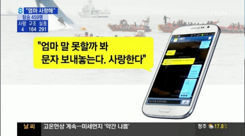이날 세월호에 탑승해 수학여행을 가던 안산 단원고등학교 한 학생은 침몰 당시인 오전 9시27분께 엄마에게 "엄마 내가 말 못할까봐 보내놓는다. 사랑한다"고 메시지를 보냈다.