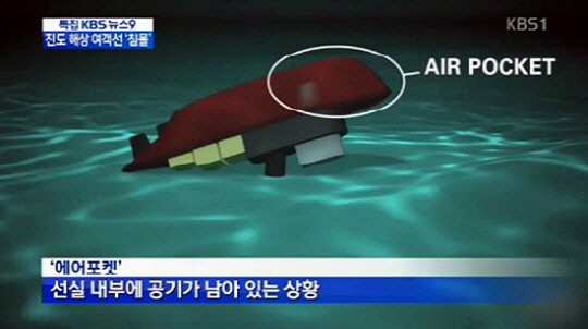 세월호의 경우 대부분의 선체가 바다 속으로 가라 앉아 있지만 선수 일부만은 수면 위로 남아 있는 상황으 로'에어포켓'이 발생했을 가능성이 점쳐지고 있다.