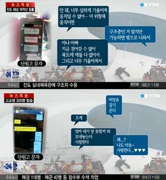 안산 단원고 2학년 신모(16) 군은 어머니에게 "엄마 내가 말 못할까봐 보내놓는다. 사랑한다"고 메시지를 보냈다. 그때까지 사고 소식을 몰랐던 어머니는 "나도 아들 사랑한다"고 답했다.
