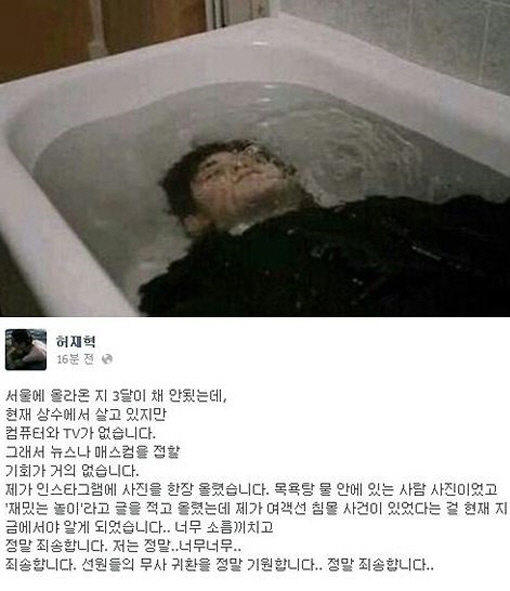 이에 허재혁은 "서울에 올라온지 3달이 채 안됐다. 현재 상수에서 살고 있는데 컴퓨터와 TV가 없다. 그래서 뉴스나 매스컴을 접할 기회가 거의 없었다. 목욕탕 물 안에 있는 사람 사진에 '재밌는 놀이'라고 글을 적었는데, 여객선 침몰 사건이 있었다는 걸 지금에서야 알게 됐다. 정말 죄송하다"라고 해명했다.