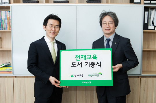 이날 천재교육 최정민 전무와 초록우산 어린이재단 이충로 서울지역본부장 등이 참석한 가운데 기증식을 갖고, 1000만원 상당의 교재를 전달했다. 천재교육은 아동복지 전문기관인 초록우산 어린이재단에서 진행하는 빈곤가정지원 사업에 동참하고자 이번 기증식을 진행했으며 기증 도서는 재단을 통해 전국의 지역아동센터와 복지관 등에 전달될 예정이다. 기증 도서는 트릭월드 시리즈, 우등생 전과, 셀파 해법 세트, 중학생을 위한 교과서 소설 전집 세트, 스토리텔링 해법수학 등 천재교육의 대표 교재 1000여 권이다.