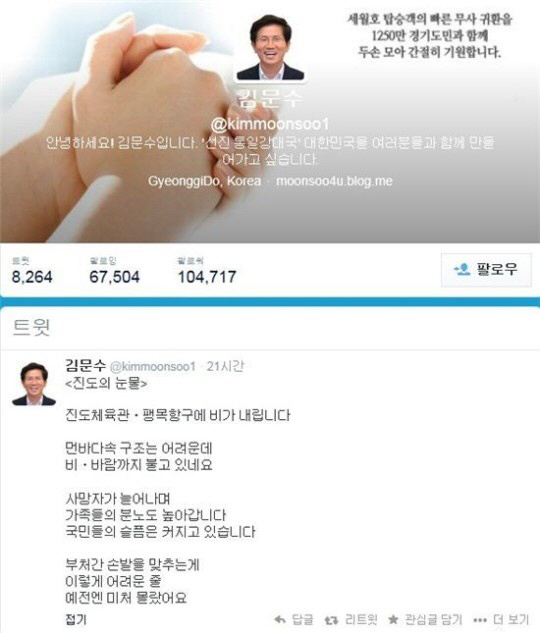 김문수 지사는 16일 자신의 트위터에 캄캄바다와 가족, 17일에는 진도의 눈물이라는 자작시를 작성했다.