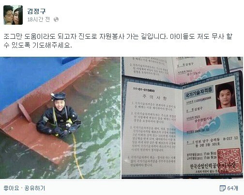 개그맨 김정구는 지난 17일 자신의 SNS에 ‘조그만 도움이라도 되고자 진도로 자원봉사 가는 길’이라며 ‘아이들도, 저도 무사할 수 있도록 기도해달라‘라는 글과 사진을 올렸다.