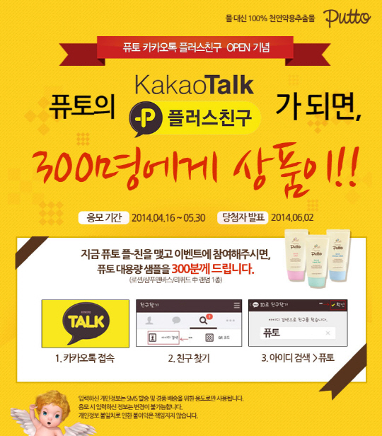 이벤트는 누구나 참여 가능하며, 5월 30일까지 퓨토와 카카오톡 플러스친구를 맺은 후 퓨토가 보내는 메시지를 따라 이벤트 페이지를 방문해 응모하면 된다. 추첨을 통해 선발된 당첨자 300명에게는 '퓨토 시크릿 로션', '퓨토 시크릿 리퀴드겔', '퓨토 시크릿 샴푸앤바스' 중 제품 하나를 선물로 증정한다. 당첨자는 6월 2일 퓨토 카카오톡 플러스친구를 통해 발표된다.