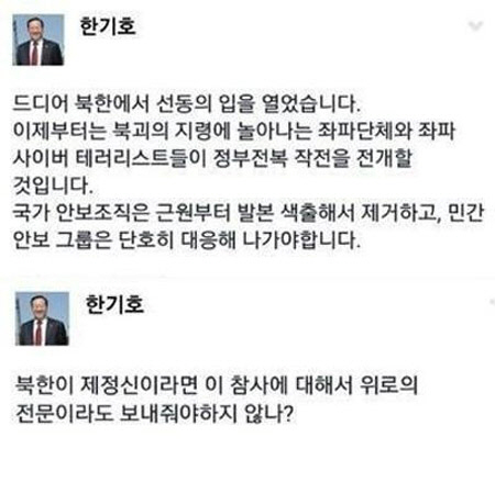 이어 그는 "드디어 북한에서 선동의 입을 열었다. 이제부터는 북괴의 지령에 놀아나는 좌파 단체와 좌파 사이버 테러리스트들이 정부 전복 작전을 전개할 것"이라며 "국가 안보조직은 근원부터 발본 색출해서 제거하고, 민간 안보 그룹은 단호히 대응해 나가야한다"라는 글을 게재했다.