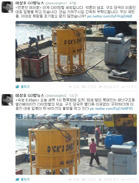 21일 이상호 기자는 자신의 트위터에 "사재 털어 잠수용 엘리베이터인 다이빙벨, 작업용 CCTV 등 수십 톤 장비와 인력을 바지선에 가득 싣고 온 알파잠수 이종인 대표. 구조당국이 난색을 표해 밤새 부두에 발이 묶여 있는 상태. 아. 시간이 없습니다"라는 글을 올렸다.