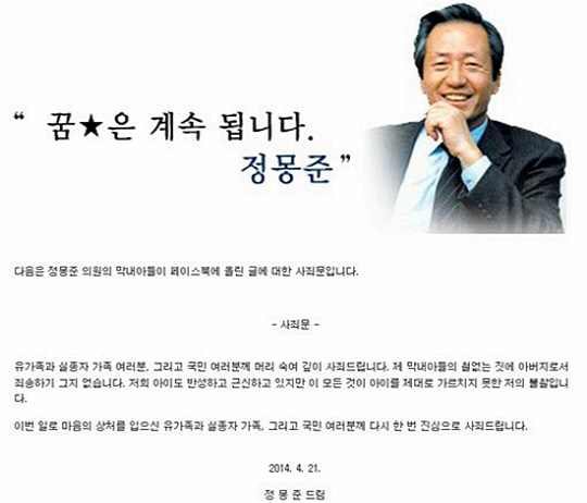 유가족과 실종자 가족 여러분, 그리고 국민 여러분께 머리 숙여 깊이 사죄드립니다. 제 막내아들의 철없는 짓에 아버지로서 죄송하기 그지없습니다. 저희 아이도 반성하고 근신하고 있지만 이 모든 것이 아이를 제대로 가르치지 못한 저의 불찰입니다.