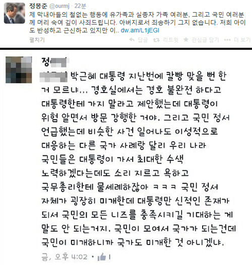 정몽준 의원은 21일 오전 자신의 트위터를 통해 "제 막내아들의 철없는 행동에 유가족과 실종자 가족 여러분, 그리고 국민 여러분께 머리 숙여 깊이 사죄드립니다. 아버지로서 죄송하기 그지 없습니다. 저희 아이도 반성하고 근신하고 있지만 이 모든 것이 아이를 제대로 가르치지 못한 저의 불찰입니다"라며 고개 숙였다.